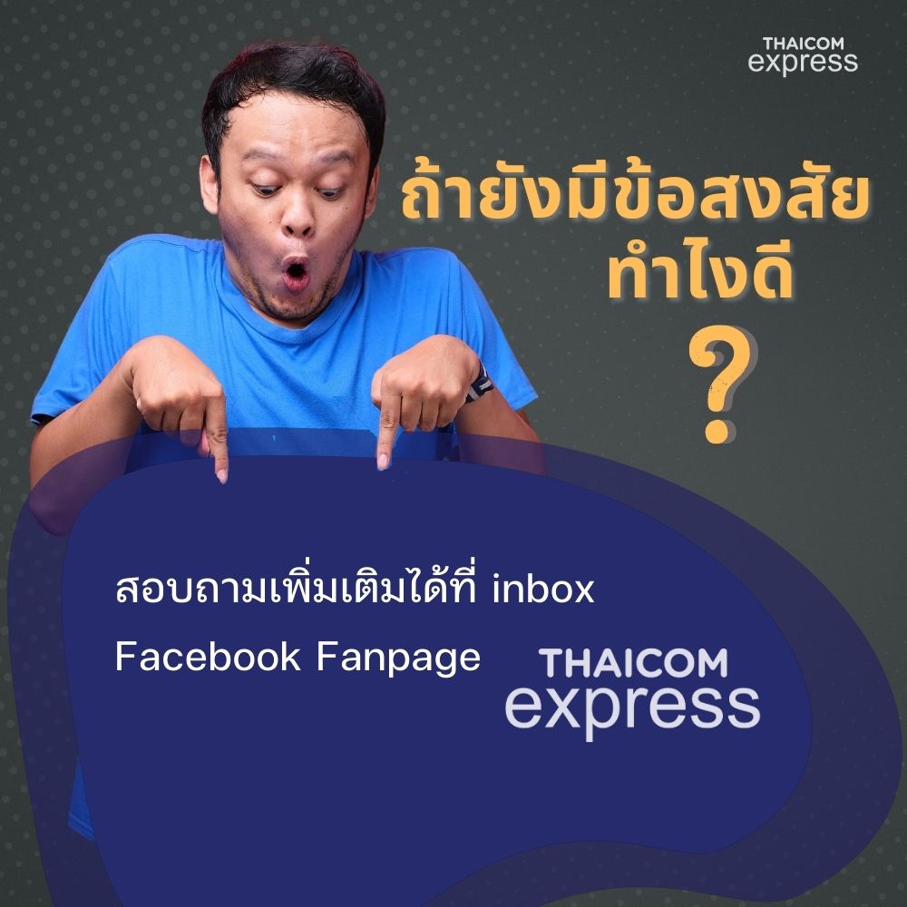 เป็นยังไงกันบ้าง ลองตอบคำถามทั้ง 5 ข้อนี้แล้วคิดว่า Thaicom Express ตอบโจทย์สิ่งที่คุณต้องการหรือไม่ หากใช่ ติดต่อเพื่อสมัครบริการกันเข้ามาได้เลย หรือหากอยากสอบถามทักเราได้ทั้งทาง inbox Faceboox Thaicom Express เลย