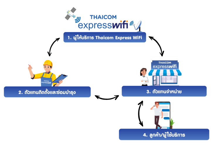 โดย Thaicom Express จะทำงานร่วมกับตัวแทนติดตั้ง เพื่อจะคอยดูแลอุปกรณ์ ให้คำแนะนำการใช้งานและขายแพ็กเกจ ให้แก่ตัวแทนจำหน่าย และตัวแทนจำหน่ายจะทำหน้าที่จำหน่ายแพ็คเกจแบบเติมเงินให้แก่ลูกค้า สร้างรายได้จากค่าคอมมิชชั่นในการขายแพ็กเกจ